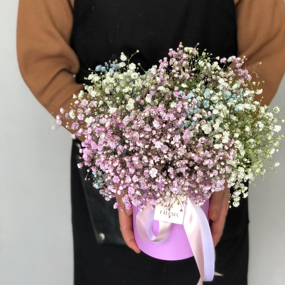 Цветная гипсофила в шляпной коробке