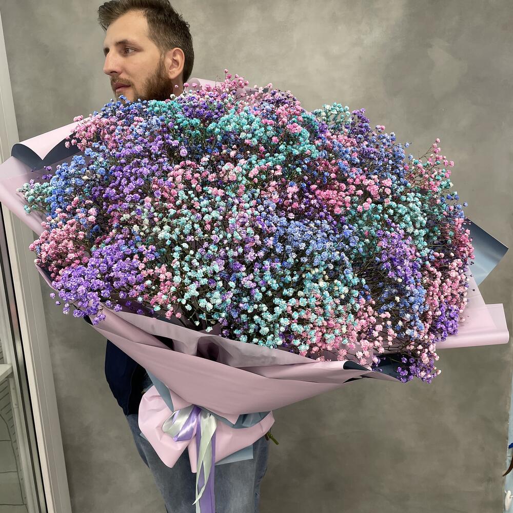 Огромная охапка цветной гипсофилы вскружит голову и навсегда запомнится вашей любимой. Невероятные впечатления обеспечены.