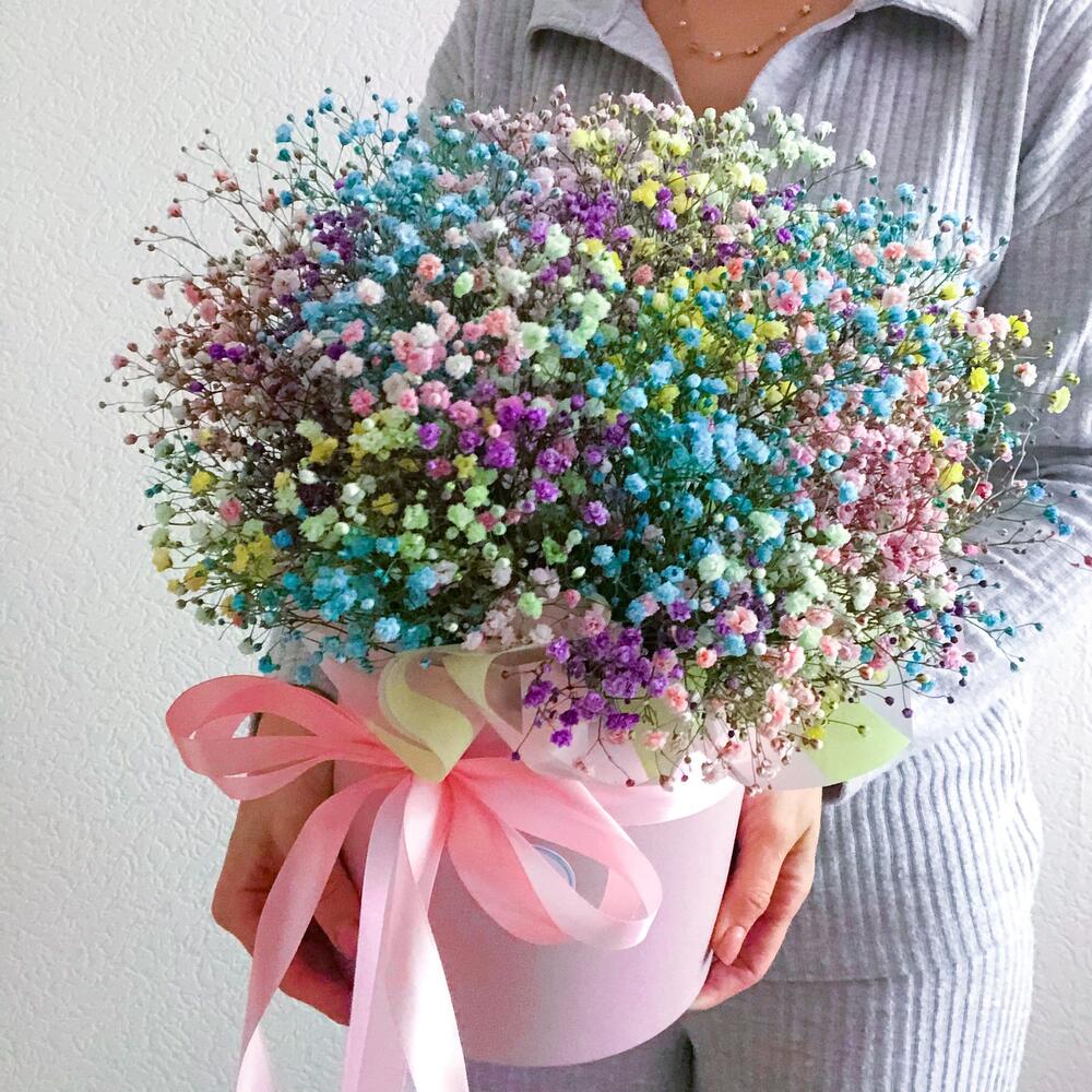 Очаровательная, воздушная композиция из гипсофилы, в шляпной коробке.Цветы стоят в специальной флористической губке,что позволяет им больше оставаться свежими и радовать получателя. Так же композиция в коробке это очень удобно и эффектно, так как не надо ставить букет в вазу и менять воду. Необходимо лишь подливать в губку воду.Инструкция по уходу за цветами прикреплена к каждому заказу.Цветы гипсофилы отличаются стойкостью и даже при высыхании не теряют, декоративности и цвета. Что позволяет, долгое время украшать интерьер в качестве сухоцветов.Подпишем открытку с вашими пожеланиями бесплатно