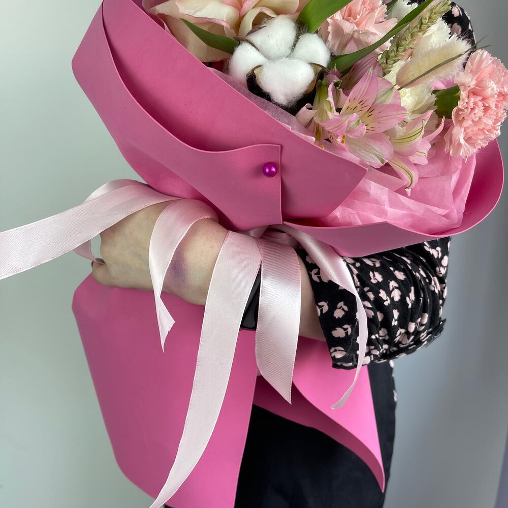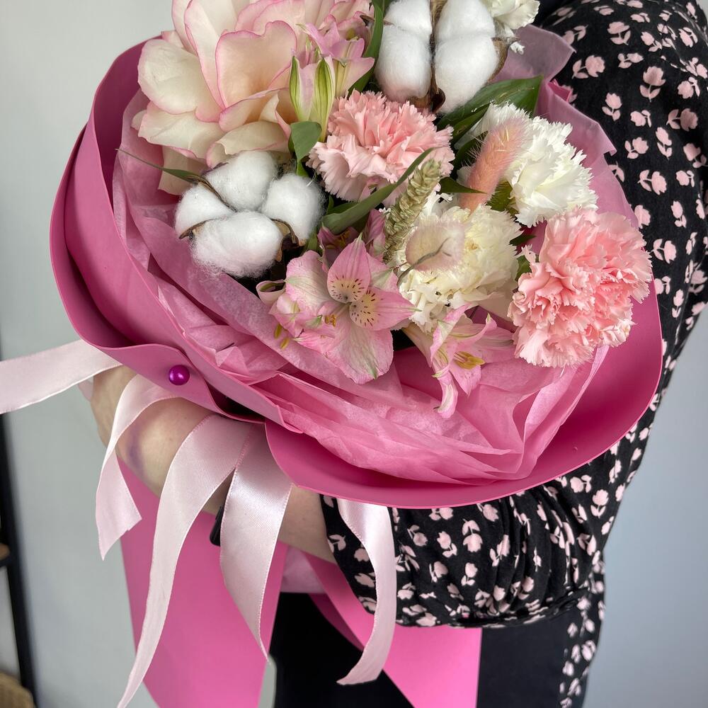 Альстромерия – 1 шт.Рускус – 5 шт.Хлопок – 1 шт.Лента атласная – 2 шт.Диантус – 4 шт.Пшеница – 1 шт.Упаковка дизайнерская – 3 шт.Французская роза – 1 шт.Лагурус – 1 шт.