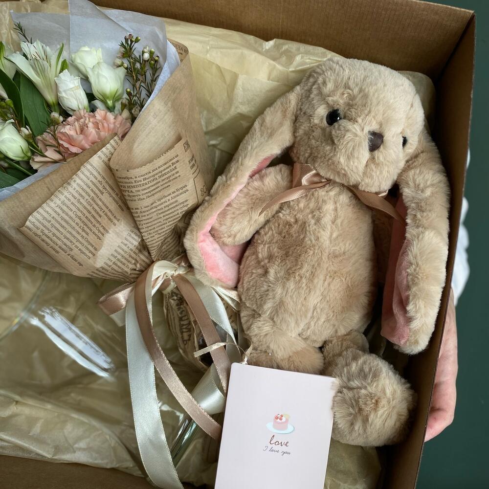 мини букет из диантусов – 1 шт.Мягкая игрушка – 1 шт.Открытка – 1 шт.Коробка – 1 шт.Упаковка – 1 шт.
