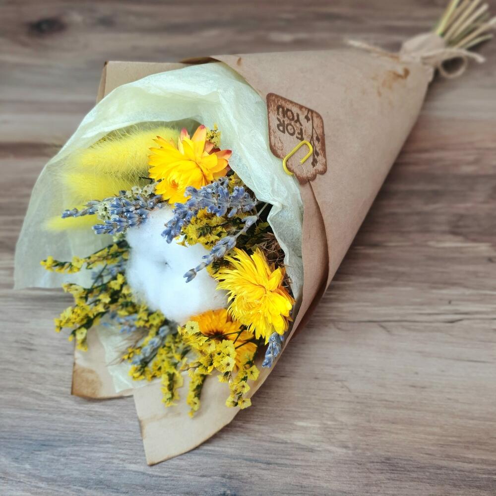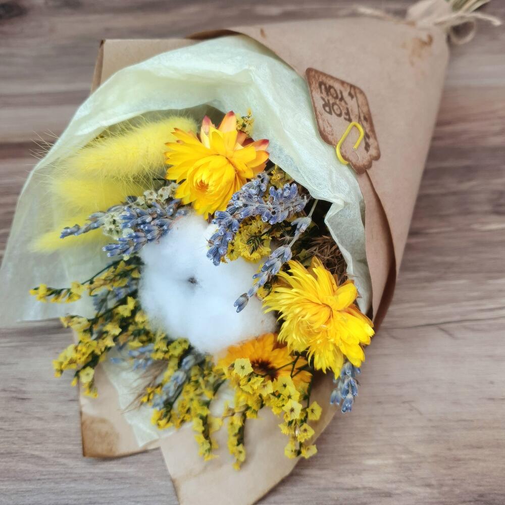 Хлопок натуральный – 1 шт.лавандин пучок – 1 шт.Гелихризум – 3 шт.Лагурус – 3 шт.статица стабилизированная пучок – 1 шт.Упаковка дизайнерская – 2 шт.