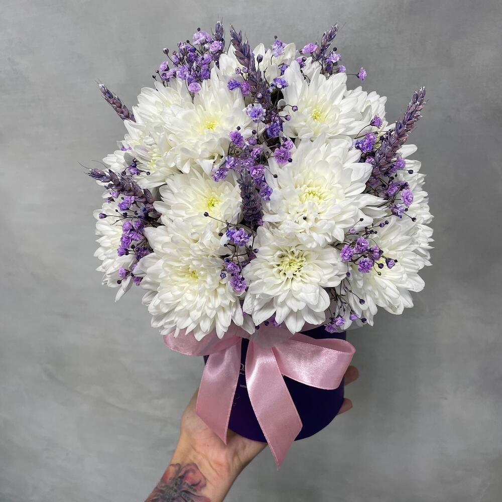 Коробка d12 – 1 шт.Оазис – 1 шт.Хризантема кустовая – 5 шт.Гипсофила фиолетовая – 2 шт.Пшеница (сухоцвет) – 9 шт.