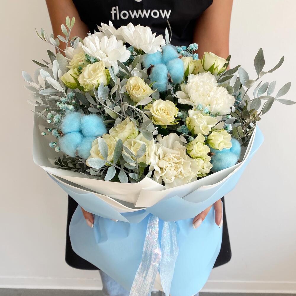 Авторский голубой букет с хлопком и кустовыми розами