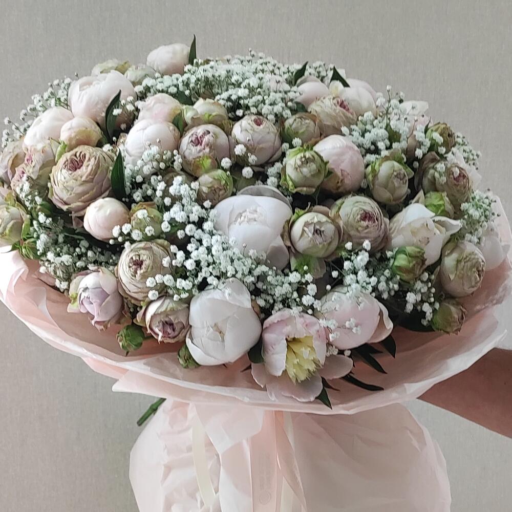Гвоздики, Кустовые розы, Пионовидные розы, Розы
