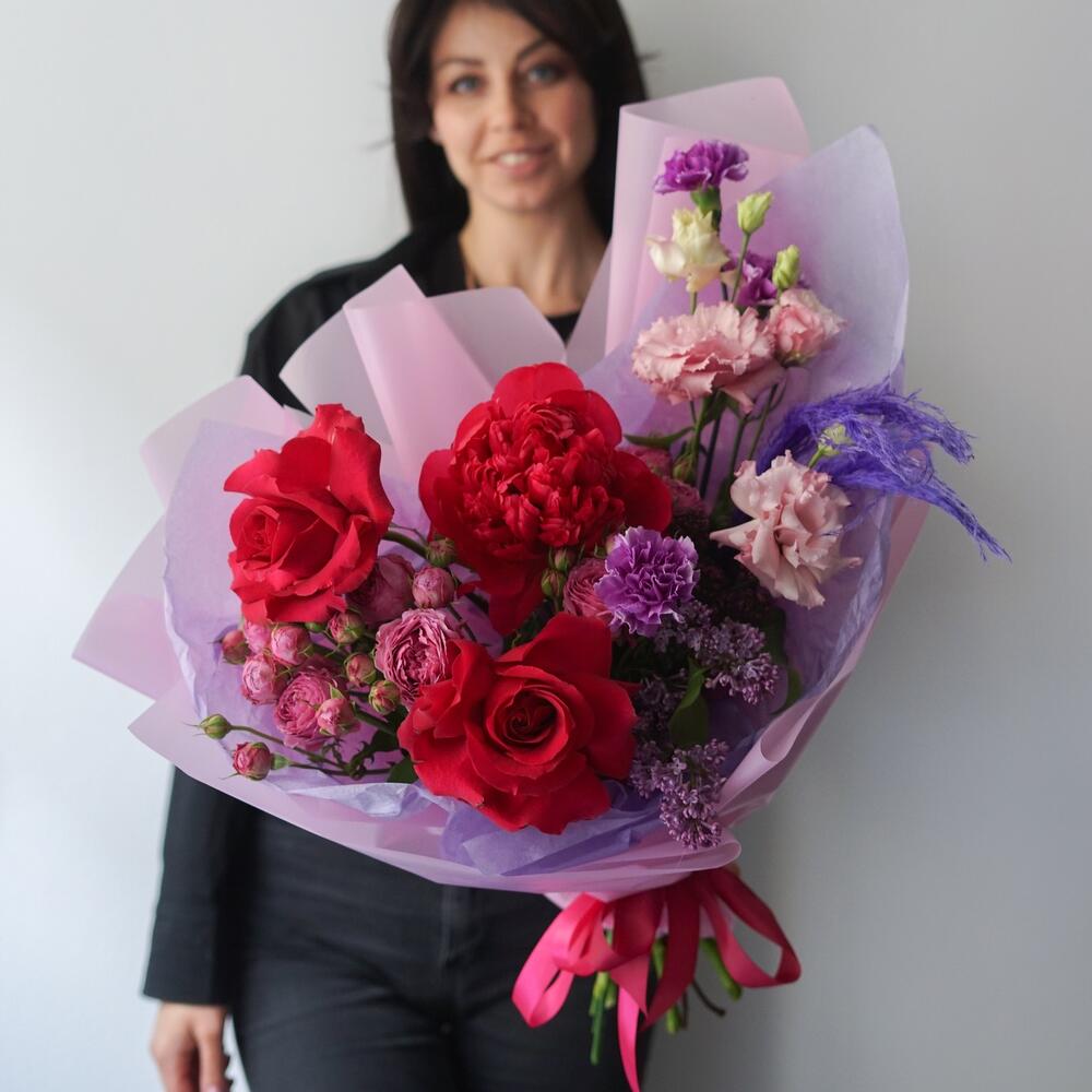 Пион – 1 шт.Роза французская – 2 шт.Роза кустовая – 2 шт.пампасная трава – 2 шт.Диантус – 4 шт.лизаантус – 2 шт.Сирень – 1 шт.Упаковка дизайнерская – 1 шт.