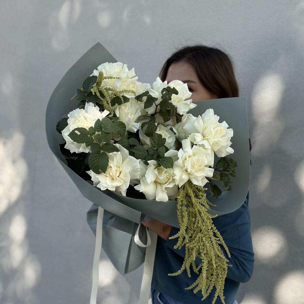 Грациозный букет из белоснежных роз, ароматных веток малины и амаранта.
