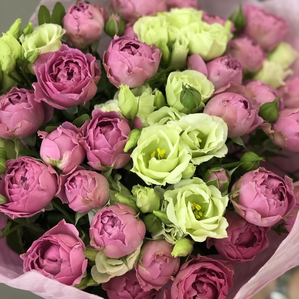 Классический букетик с модной розой Мисти Баблс и нежной эустомой