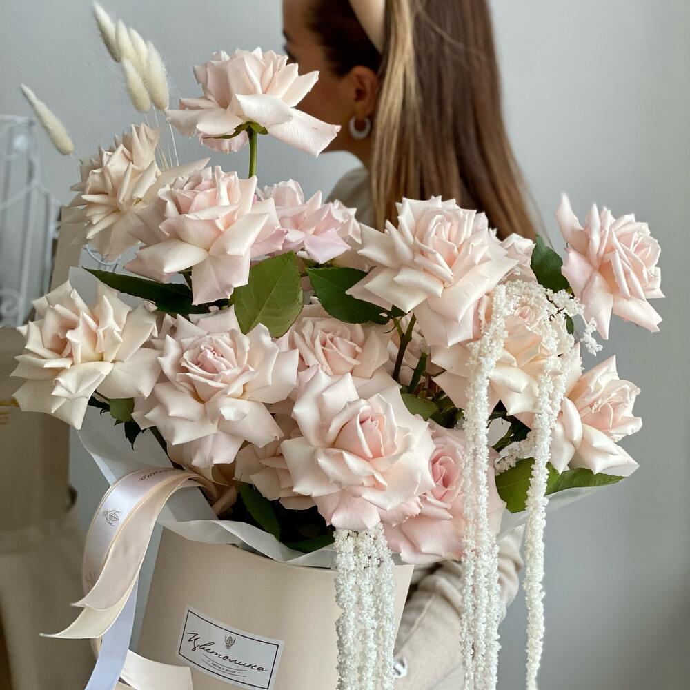 Роза сортовая – 25 шт.Сухоцветы – 10 шт.фото – 1 шт.Коробка круглая – 1 шт.упаковочная коробка – 1 шт.