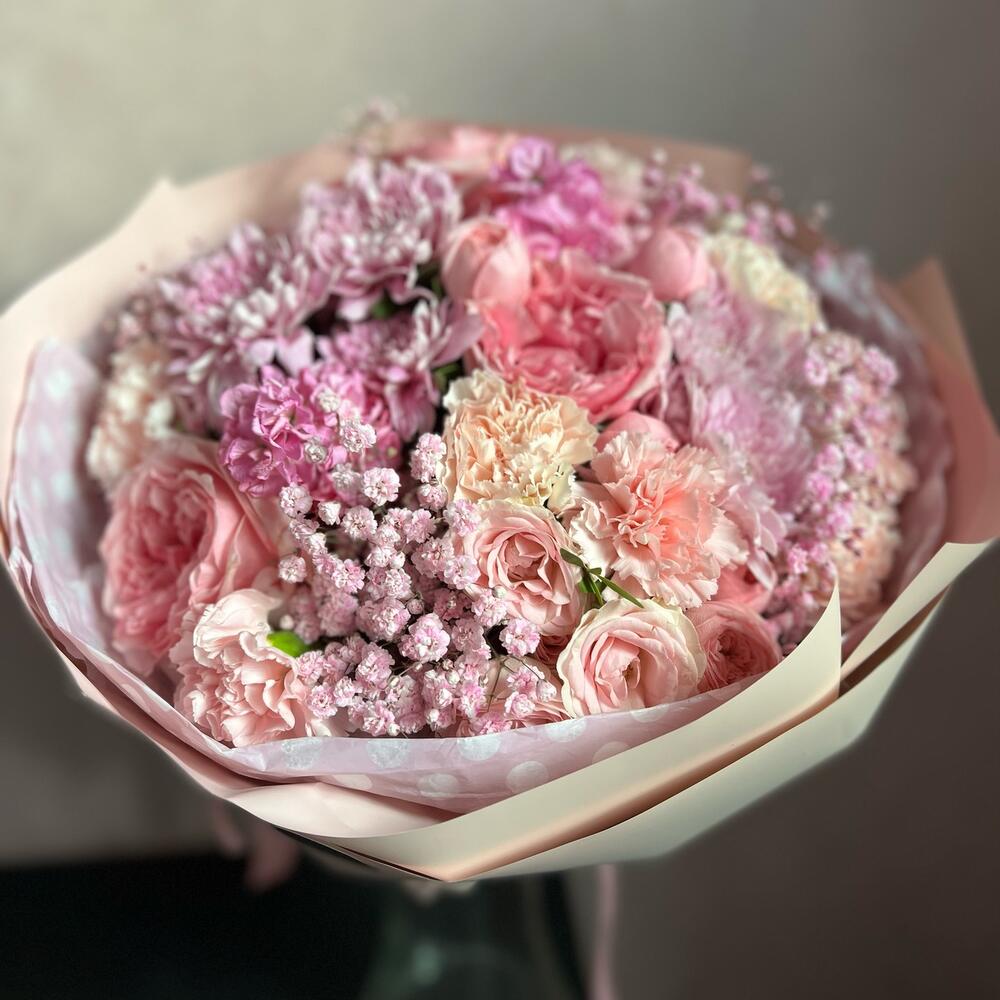 Пионовидная роза – 5 шт.Диантус – 9 шт.Кустовая хризантема – 2 шт.Маттиола – 2 шт.Кустовая роза – 1 шт.Пионовидная кустовая роза – 2 шт.Гипсофила – 1 шт.декоративная упаковка – 1 шт.Атласная лента – 1 шт.