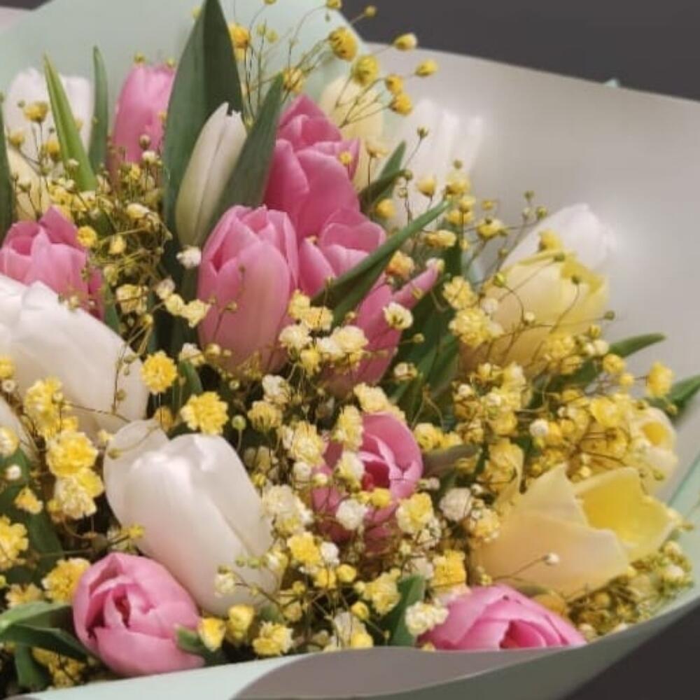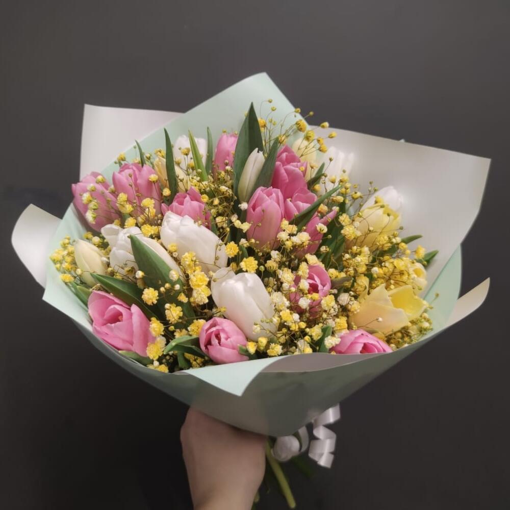 Гипсофила – 3 шт.Тюльпан – 21 шт.Упаковка дизайнерская – 1 шт.